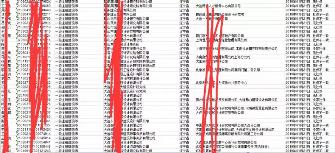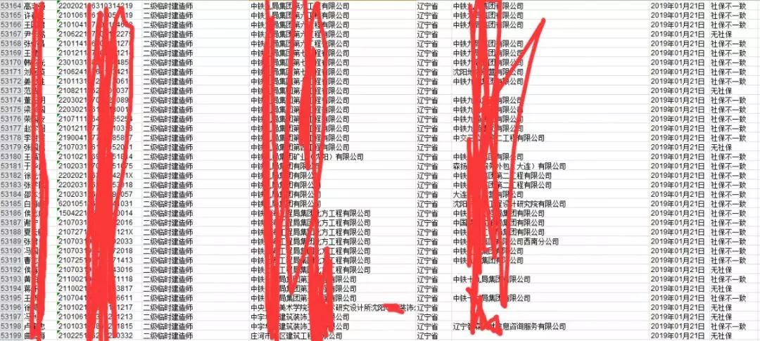 重磅消息!遼寧省掛證名單已出。據網友爆料,有5萬多人,不止包含勘察設計類,一建、監理等等,并且包含“二級建造師”,而且還包含“二級臨時建造師”。這打破了二級建造師不在自查范圍之內的傳言,名單還缺造價工程師,估計將來還會補充。并且,不止國企和央企,還有私企!!也打破了私企不在這次自查范圍內的傳言。看來私企這次也要顫抖了。這也證實之前公眾號文章所說的:“查社保軟件已經下發到了省建設廳”。看來一切不是空穴來風,皆有預兆。
