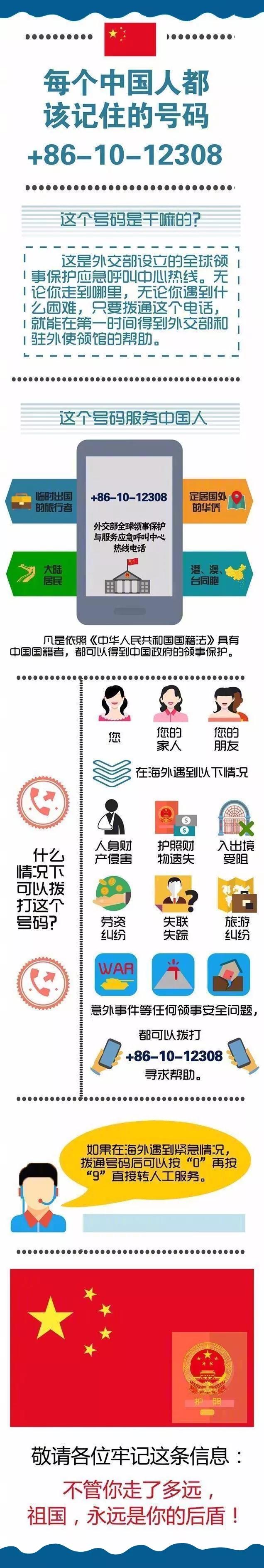 提醒中國游客,如在國外遇到緊急情況,請盡快聯(lián)系外交部全球領(lǐng)保與服務(wù)應(yīng)急呼叫中心,電話:+86-10-12308。不管同胞身處海外哪個(gè)角落,都能獲得祖國幫助!