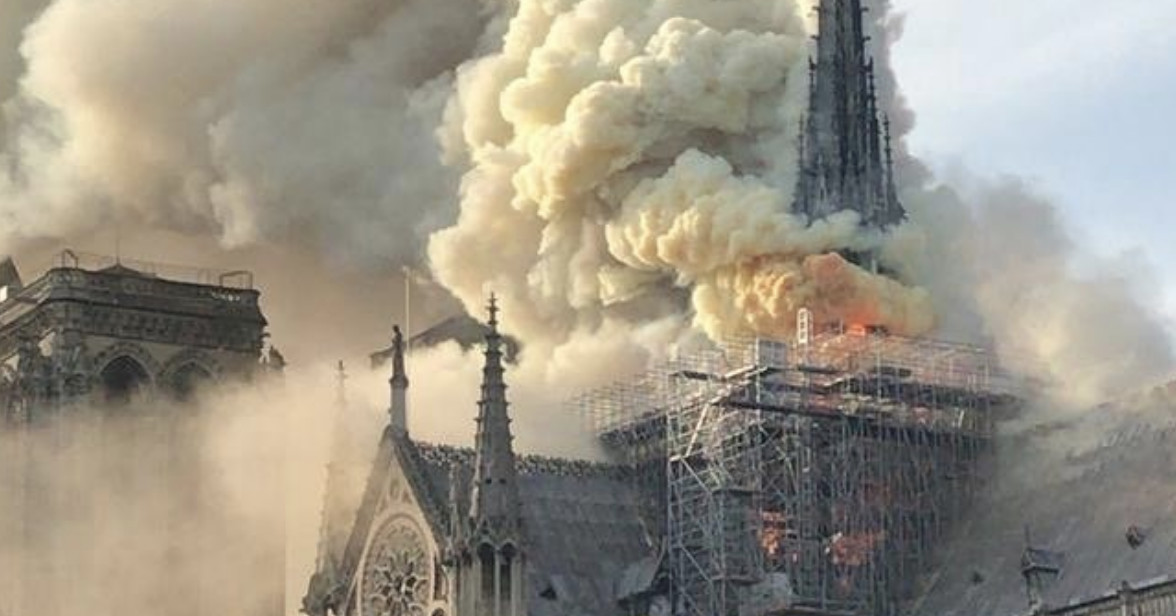 火勢蔓延速度很快,難以控制。在緊張圍觀的人群注視下,巴黎圣母院標志性的尖頂被燒斷,坍塌倒下。
