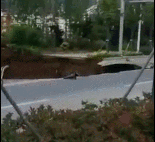 視頻顯示,路面出現(xiàn)大面積塌陷,一輛小轎車,停在塌陷坑邊緣。
