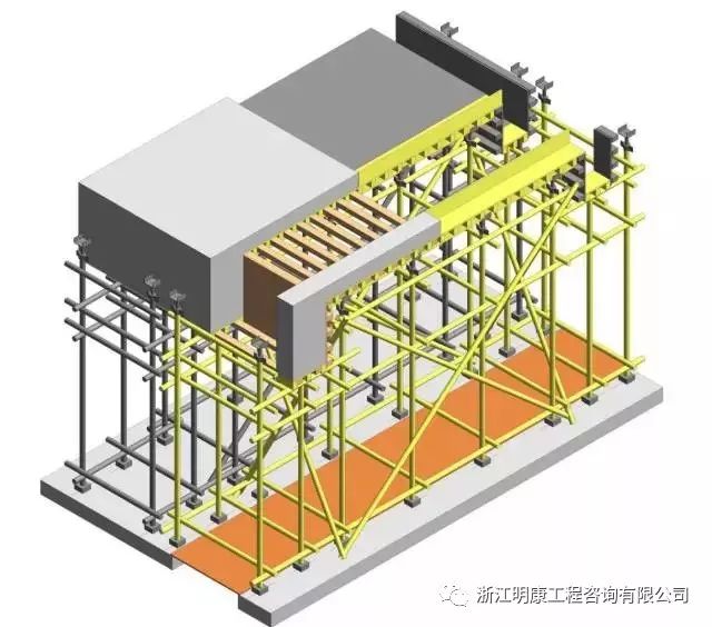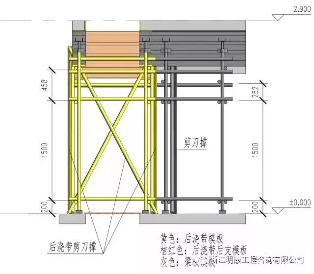 圖示按不同的顏色區分:灰色為梁板模板,可以先拆,黃色為后澆帶模板,是一個獨立的支撐體系,桔紅色是后支部分,在后澆帶清理剔鑿完成后支設,以下是詳細做法: