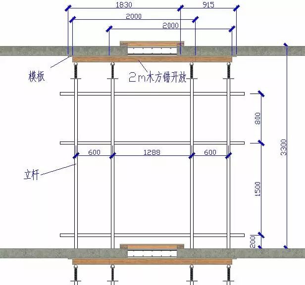 立桿布置如上圖所示,下面樓板采用預制過梁替代,后澆帶寬度800mm,采用模板封閉。