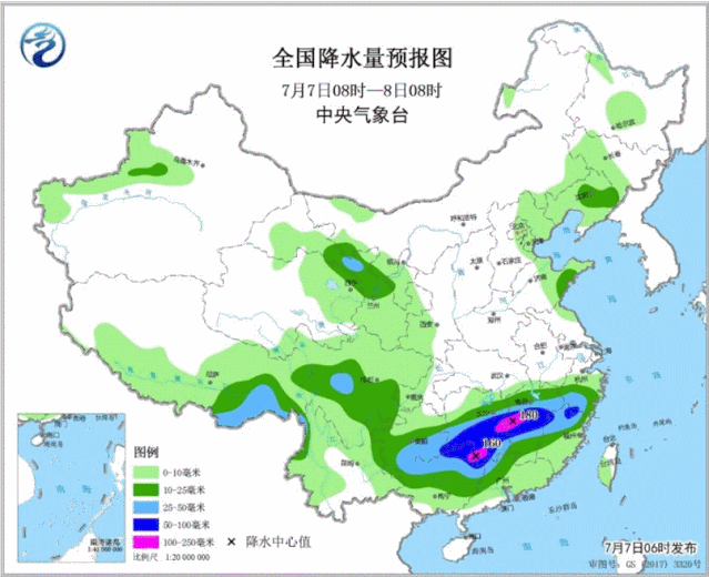 7月7日08時至8日08時,貴州、廣西、廣東、湖南、江西、福建、浙江以及西藏等地有大雨,貴州、廣西、湖南、江西、浙江、福建等地的部分地區有暴雨或大暴雨(100~180毫米),上述部分地區局地并伴有雷暴大風或短時強降水等強對流天氣。