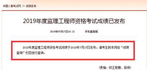2019年度監理工程師資格考試成績于2019年7月17日發布。