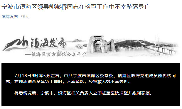 7月18日上午,寧波市鎮(zhèn)海區(qū)委常委、鎮(zhèn)海區(qū)政府黨組成員熊澎橋,在勘查建筑工地時不幸墜落,經搶救無效身亡。