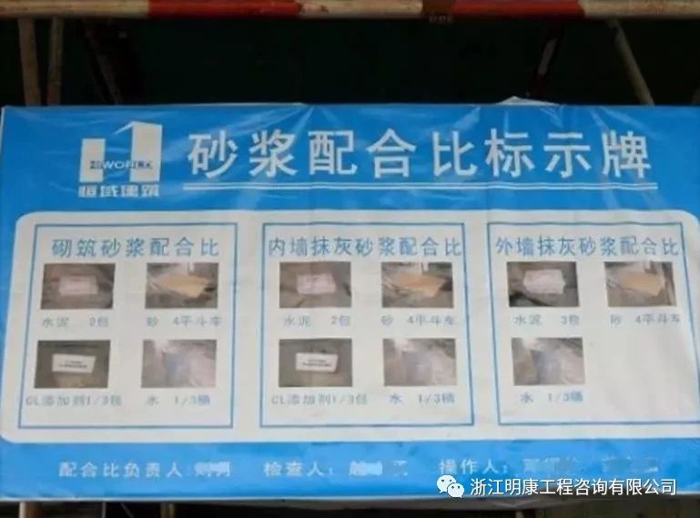 拌制現場懸掛傻瓜式配合比牌:將重量換算成容器計量桶(車),便于操作。