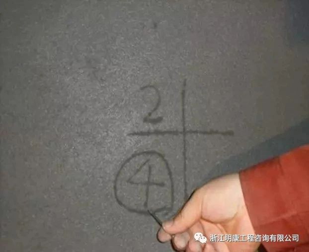 抹灰完成后,總包、監理、甲方實測結果分別用白、藍、紅色粉筆標注在墻面上。