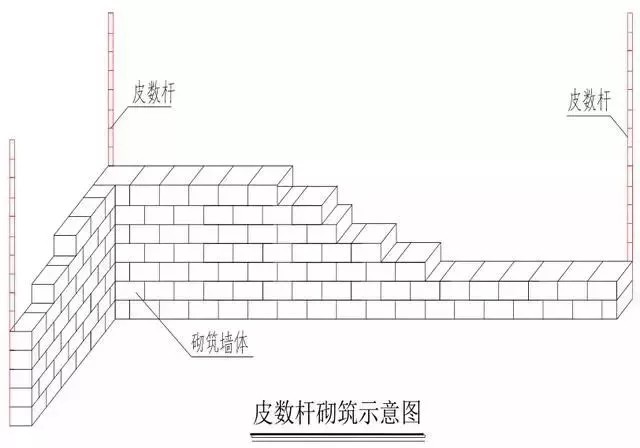 砌塊組砌: 排磚完成后,在各轉角處,且間距不超過 15m 設立皮數桿,并拉通線(有條件的可采用紅外線水平儀) 。在皮數桿上注明門窗洞口、拉結筋、圈梁、過梁的尺寸標高。 按設計標高要求立好皮數桿,每跨立兩根(靠近柱子處) ,砌體施工時,必須在墻體兩側雙面掛線,掛線一定要拉緊繃直。如下圖示意: