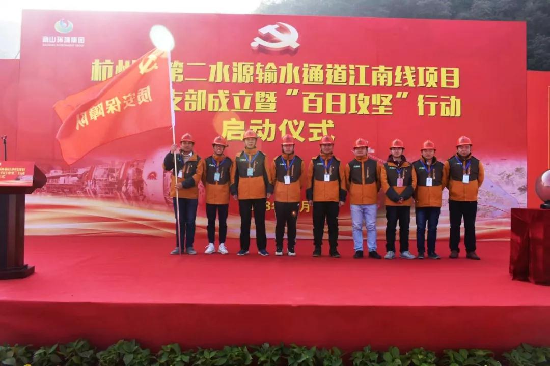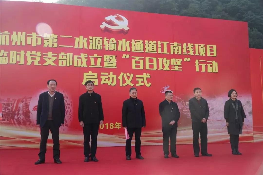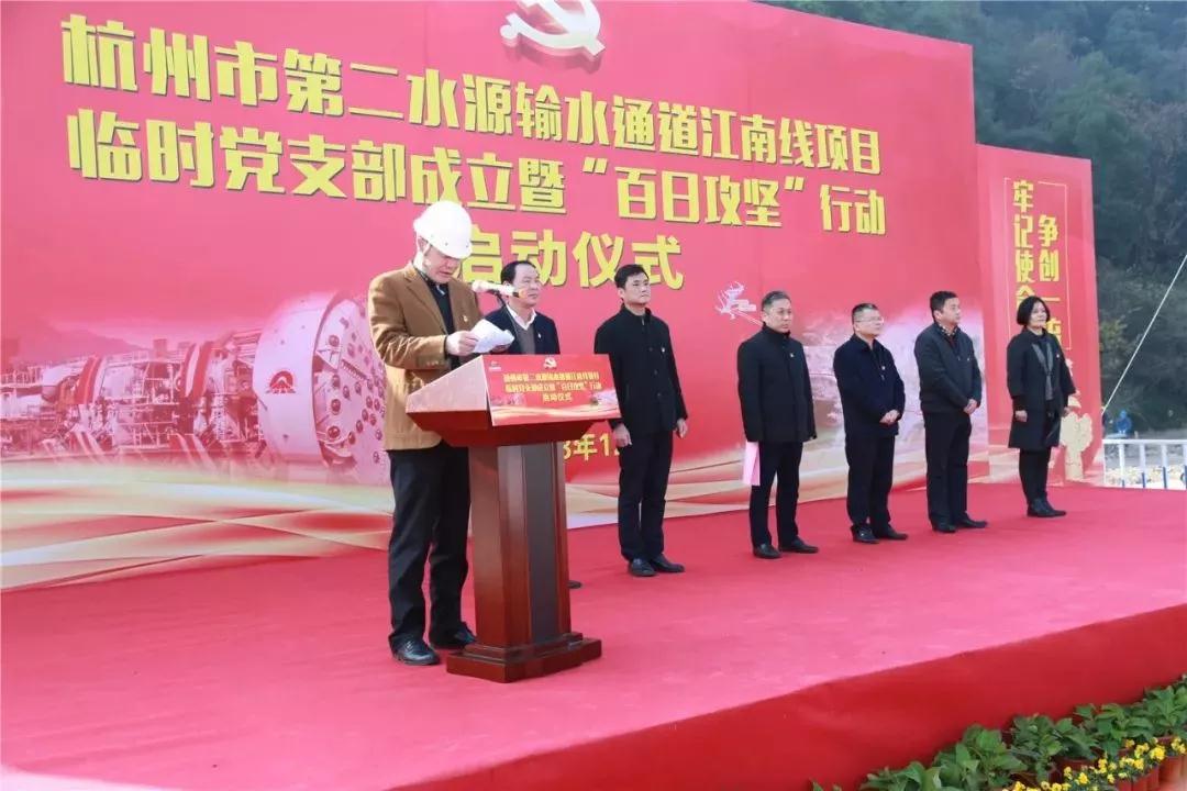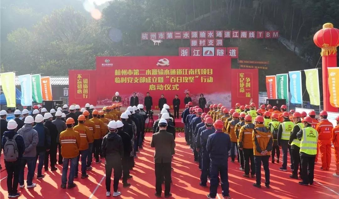 為積極發揮項目臨時黨支部的戰斗堡壘作用和黨員先鋒模范作用,確保杭州市第二水源輸水通道江南線工程安全、優質、高效、快速地推進,12月17日上午,杭州市第二水源輸水通道江南線項目臨時黨支部成立暨“百日攻堅”行動啟動儀式在江南線山嶺段滕村支洞前廣場隆重舉行。