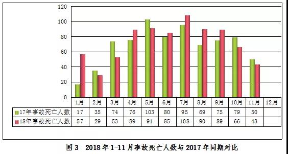 2018年1-11月,全國共發生房屋市政工程生產安全事故698起、死亡800人,比去年同期事故起數增加55起、死亡人數增加47人,分別上升8.55%和6.24%(見圖2、圖3)。其中,事故死亡人數較多的省(區、市)有江蘇(88人)、廣東(78人)、四川(59人)、安徽(45人)、重慶(45人)、黑龍江(30人)、浙江(30人)、河南(28人)、山東(27人)、福建(26人)、江西(25人)、貴州(25人)、甘肅(25人)、寧夏(24人)、湖北(23人)、上海(22人)、湖南(21人)。
