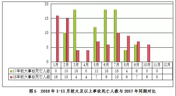2018年1-11月,全國共發生房屋市政工程生產安全較大及以上事故21起、死亡84人,比去年同期事故起數減少1起、死亡人數減少2人,分別下降4.55%和2.33%。